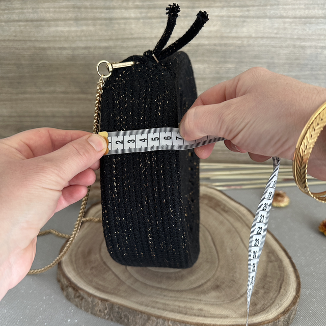 Entièrement fait main en corde de coton haut de gamme, il est solide, léger et agréable à porter. La bandoulière en métal doré et la doublure en satin froissé doré apportent une touche précieuse qui change tout.