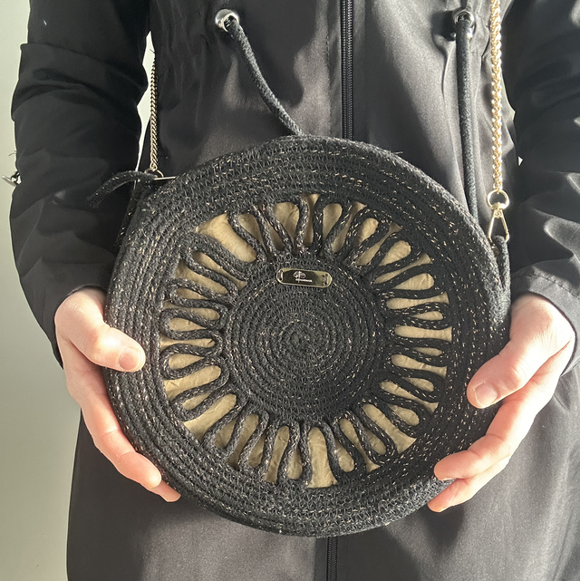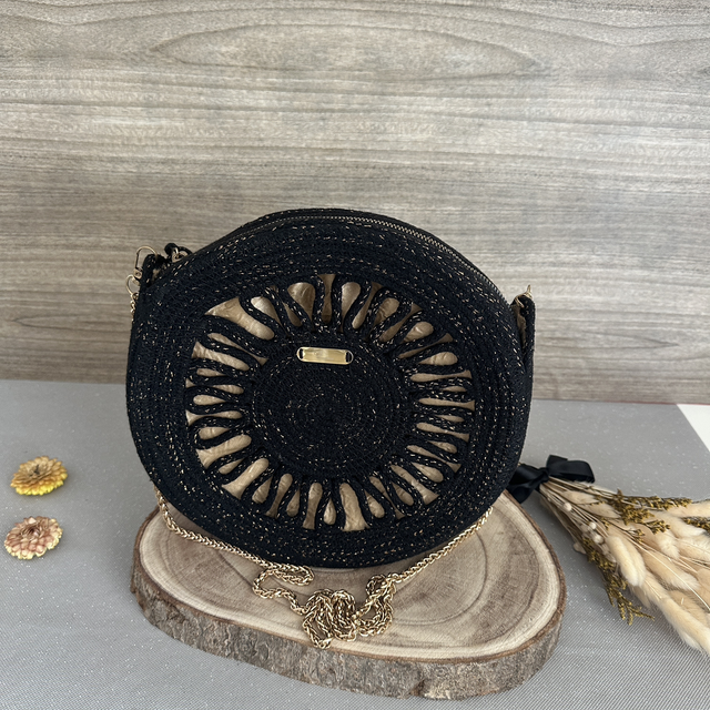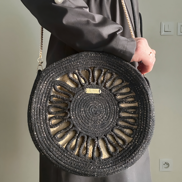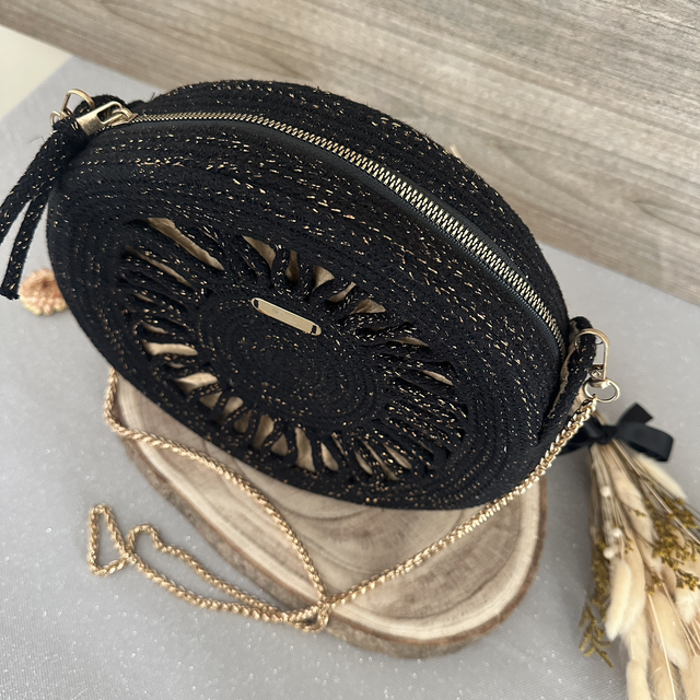 Cyria est un sac rond chic et épuré. Son noir profond relevé de fils dorés lui donne une allure élégante, parfaite pour le quotidien comme pour les soirées.